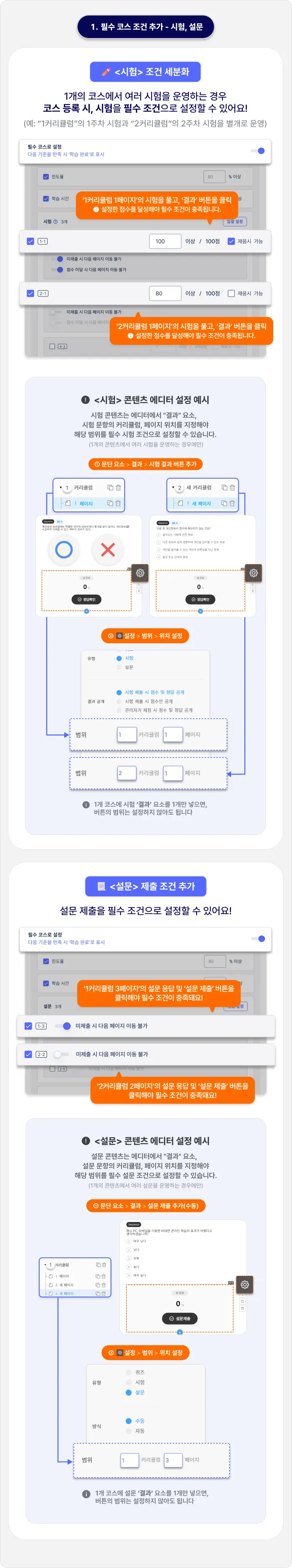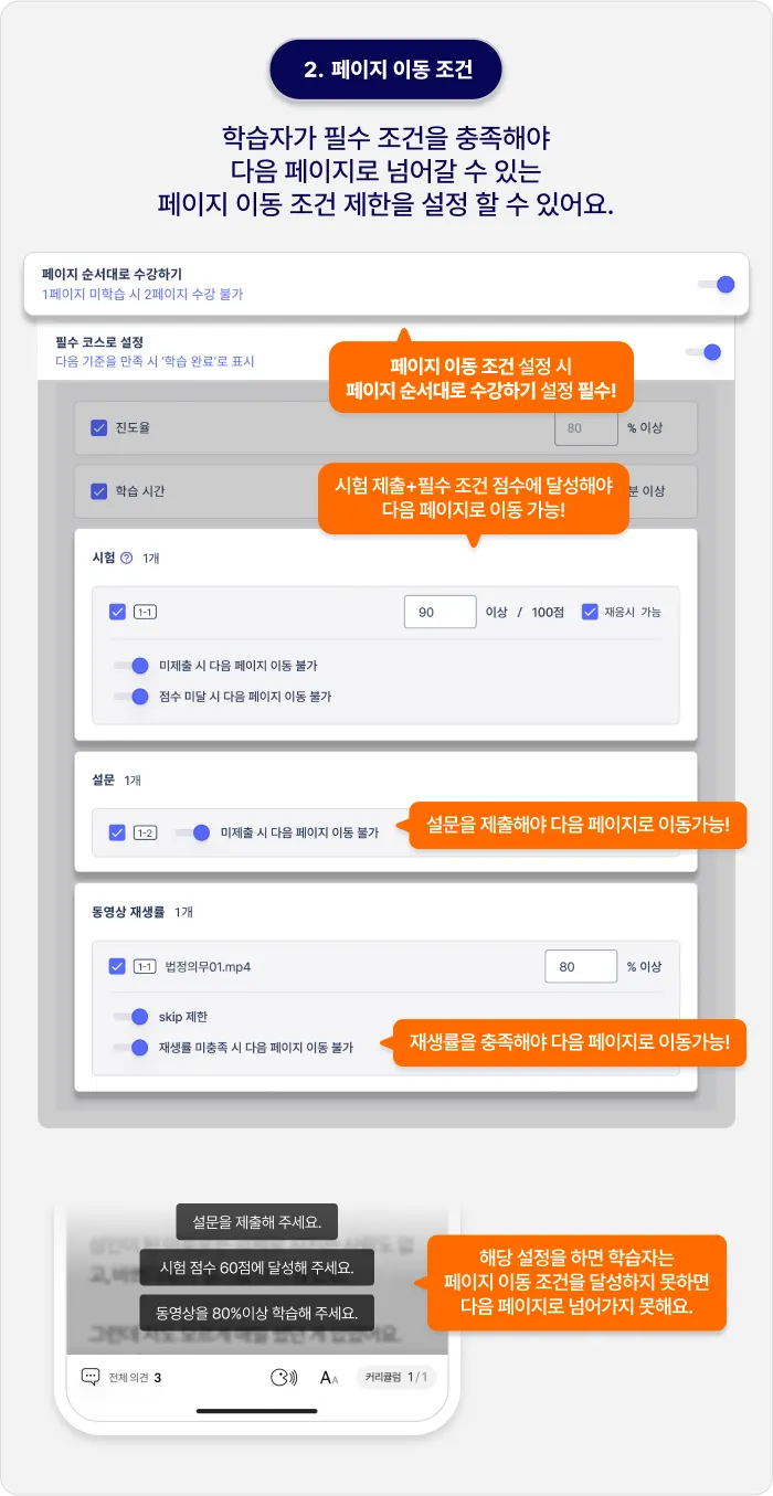 필수 코스 조건이 더욱 세분화되고 다양해졌습니다. 커리큘럼별 시험과 설문을 필수 조건으로 설정할 수 있으며, 필수 조건을 충족하지 않으면 다음 페이지로 이동할 수 없게 제한할 수 있습니다. 더욱 강화된 필수 학습 과정을 운영해보세요