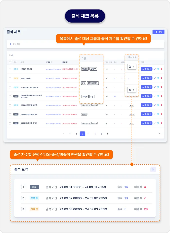 출석 관리 ▸ 출석 상태, 출석 및 미출석 인원 확인
