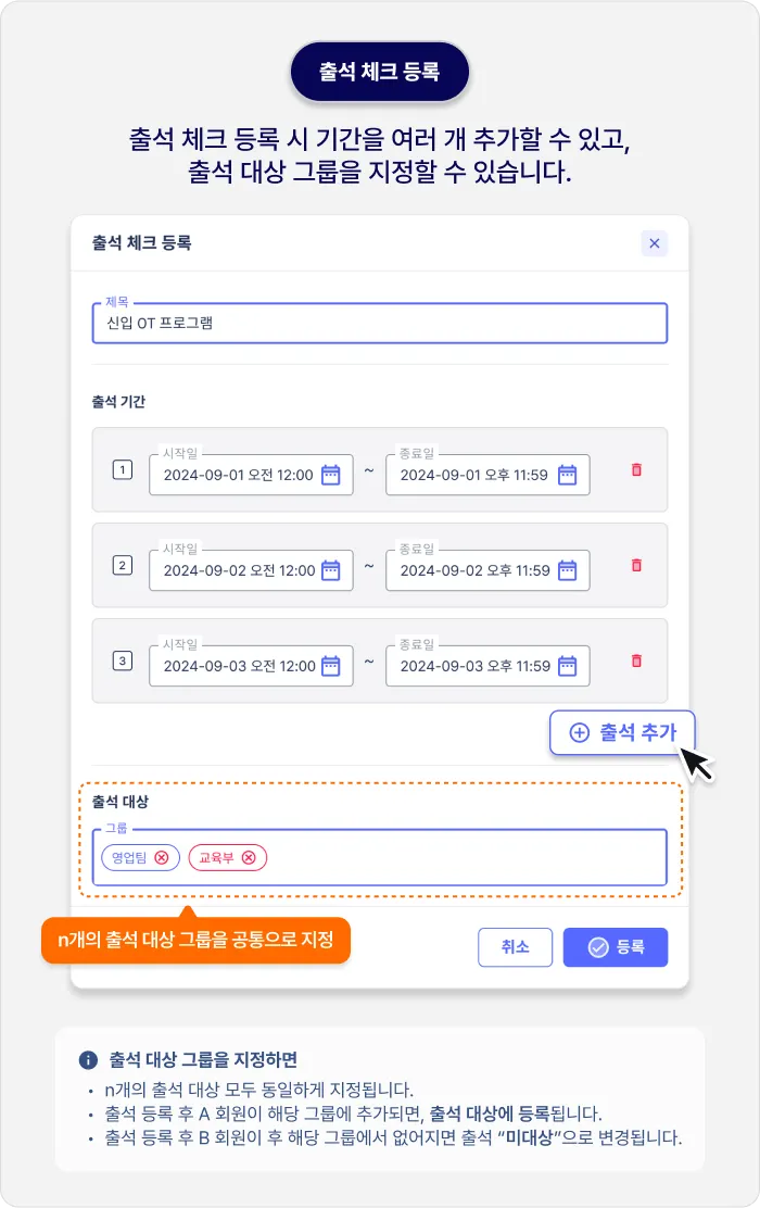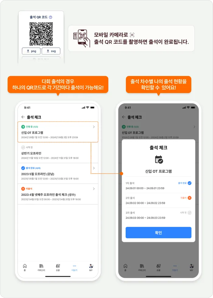 출석 체크 등록을 할 때 여러 기간의 출석을 한 번에 등록할 수 있고, 하나의 QR코드로 여러 개의 출석을 체크할 수 있게 됩니다. 출석 기능을 더욱 효율적으로 활용해보세요