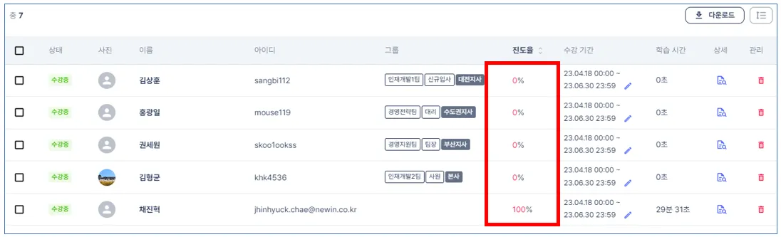 [수강 관리] 에서 학습자의 진도율을 확인할 수 있습니다.