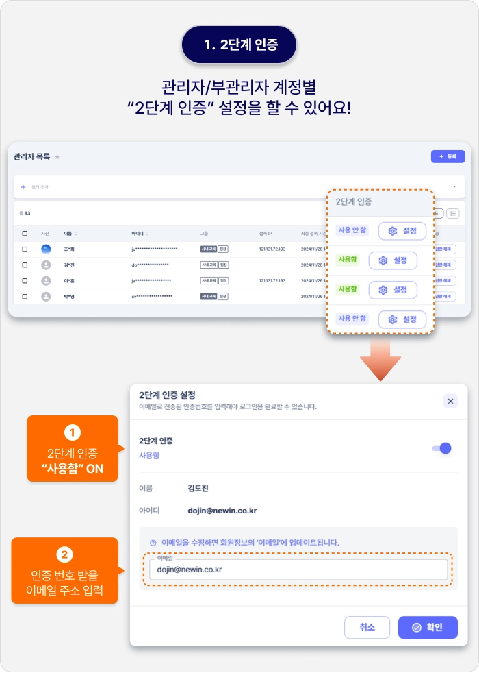 관리자, 부관리자는 2단계 인증을 통해 로그인을 할 수 있도록 설정할 수 있고,