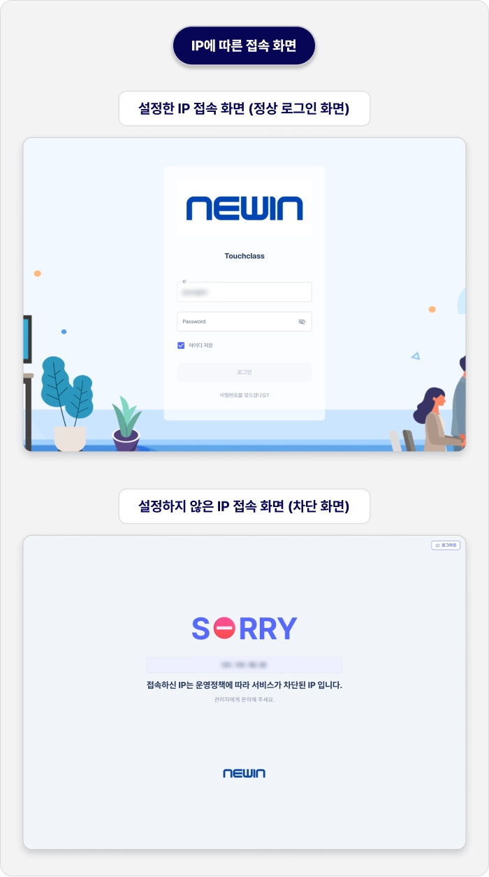관리자, 부관리자, 학습자는 터치클래스 웹 사이트에 접속할 수 있는 IP를 설정할 수 있습니다
