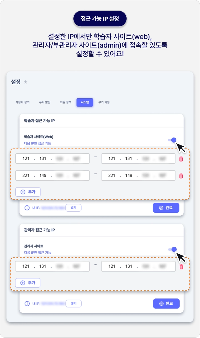 설정 ▸ 시스템 ▸ 학습자/관리자 접근 가능 IP 설정