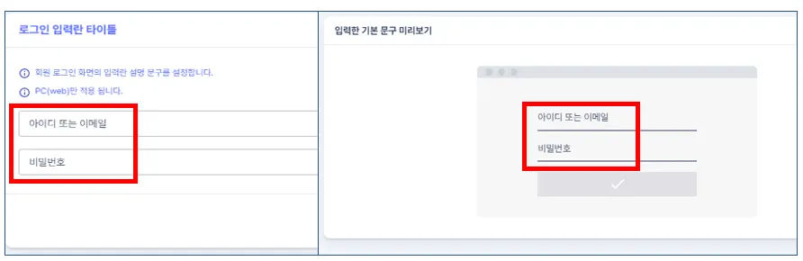 ⑥ 로그인 입력란 타이틀 : 회원 로그인 화면의 아이디/비밀번호 입력란의 설명 문구입니다.