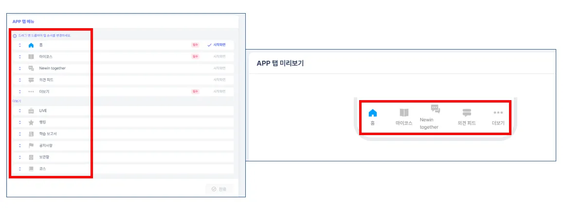 ⑨ APP 탭 메뉴 : 앱 하단에 표시되는 메뉴와 더보기 메뉴의 순서입니다.