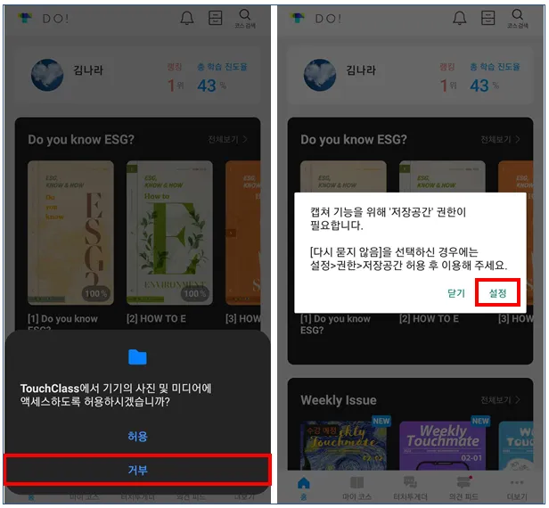 ① 터치클래스 앱(App)에 로그인▸[캡쳐 기능을 위해 ‘저장공간’ 권한이 필요합니다] 팝업▸[확인]