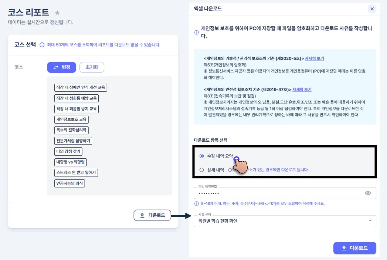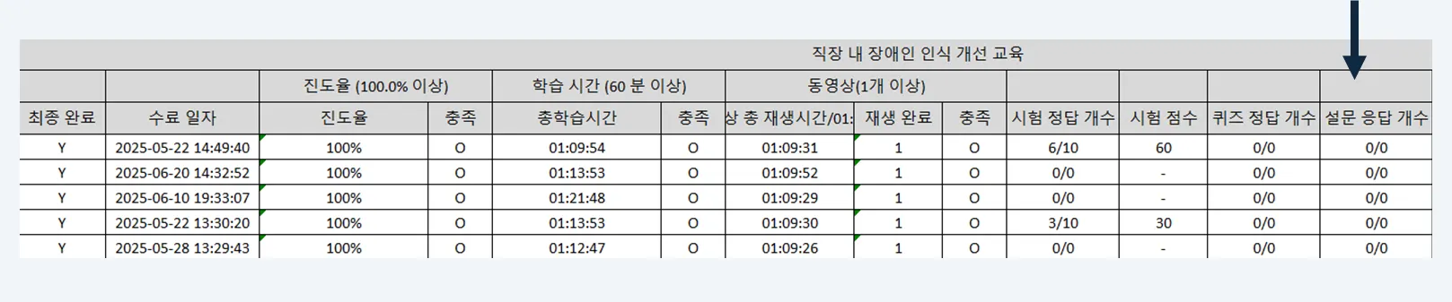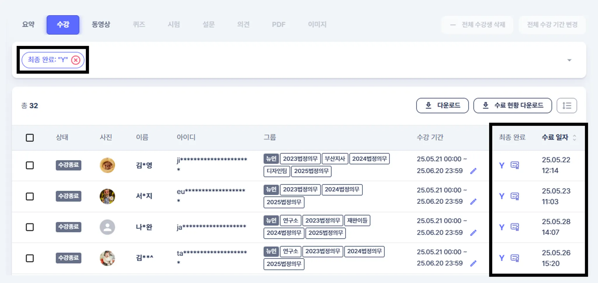 필수 코스에서 “최종 완료 : Y” 필터로 수료 인원, 수료 일자 확인 가능