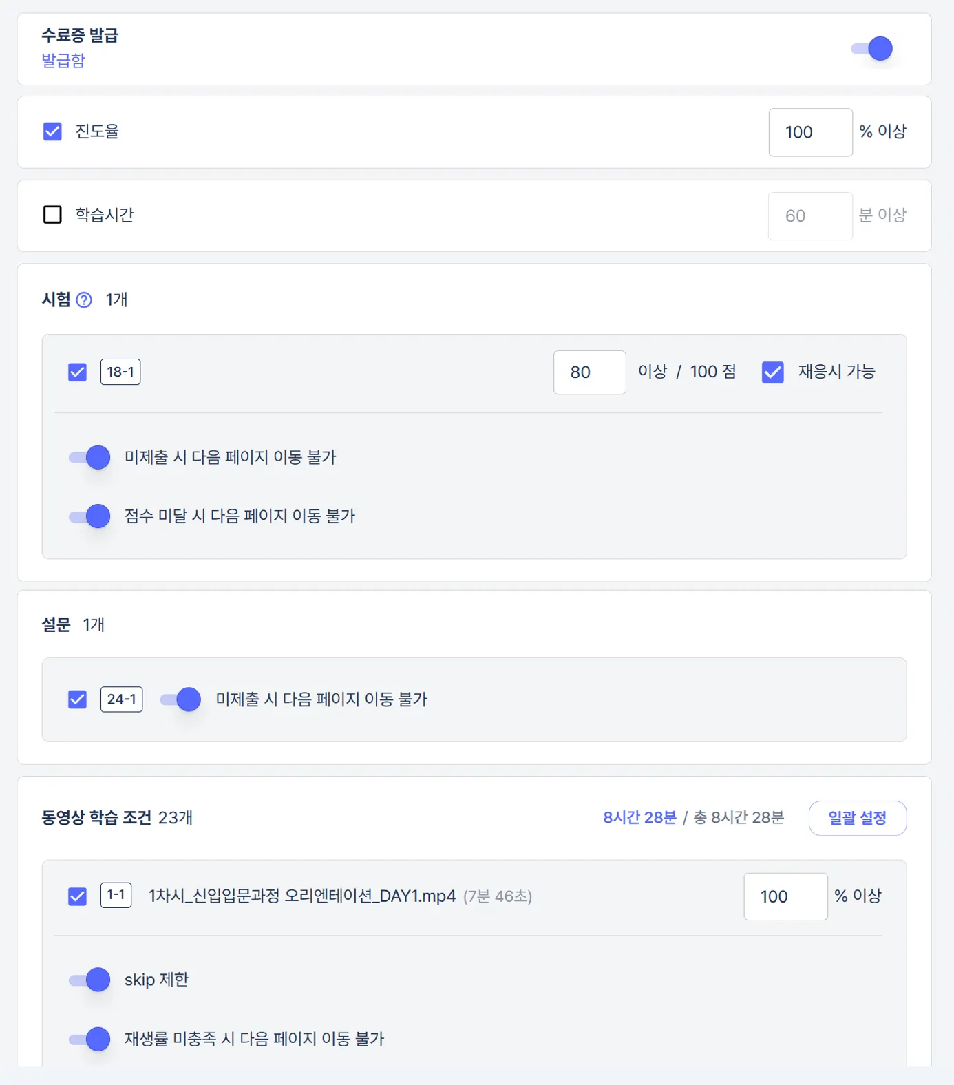 ② 진도율/학습시간/시험/설문/동영상 재생률의 조건을 설정