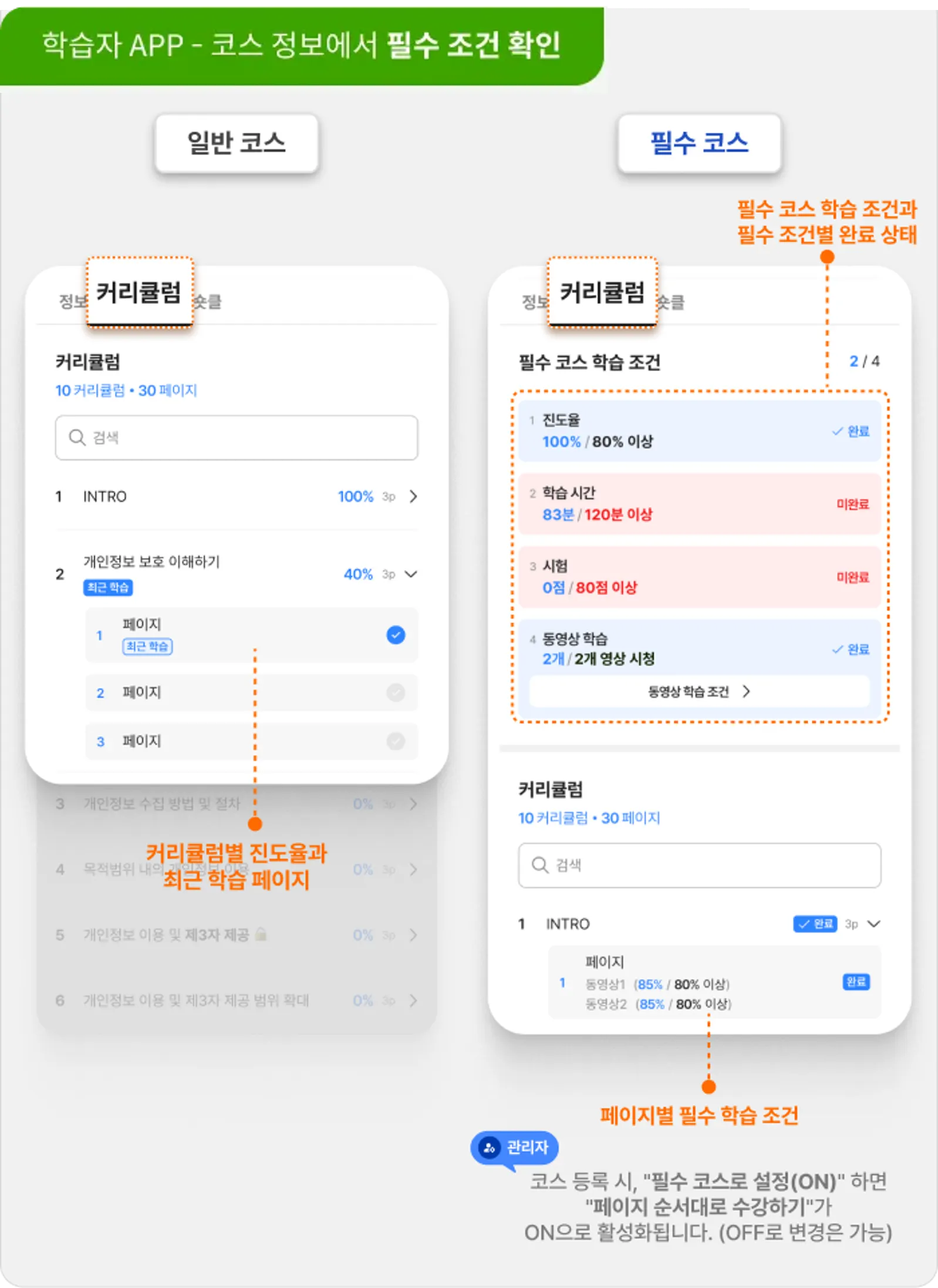 필수 코스 설정 기준대로 학습을 완료하면 ‘학습 완료’로 표시됩니다.