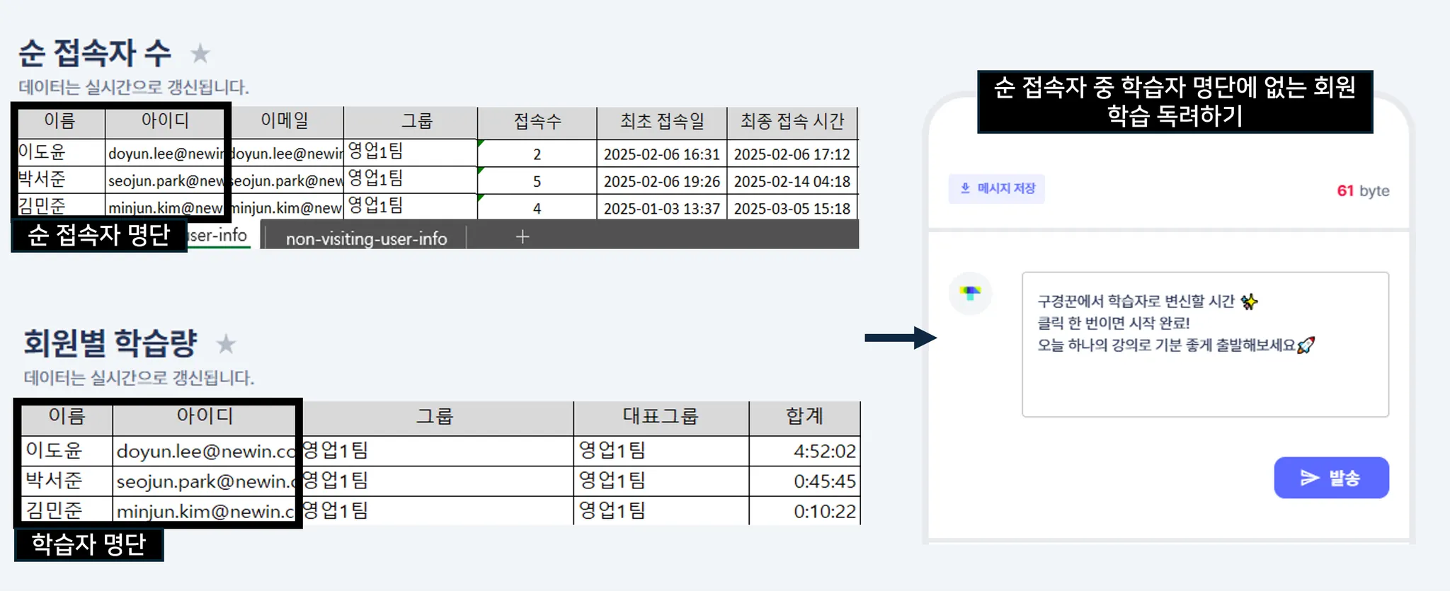 ▸ ‘접속은 하지만 학습을 하지 않은 회원’을 확인하고, 푸시 메시지나 팝업으로 학습을 독려할 수 있습니다.