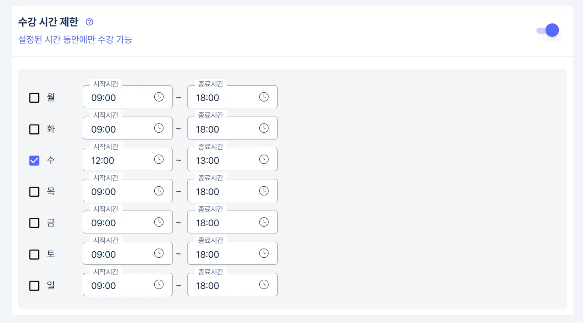 설정한 시간 동안에만 수강을 할 수 있도록 설정할 수 있습니다.