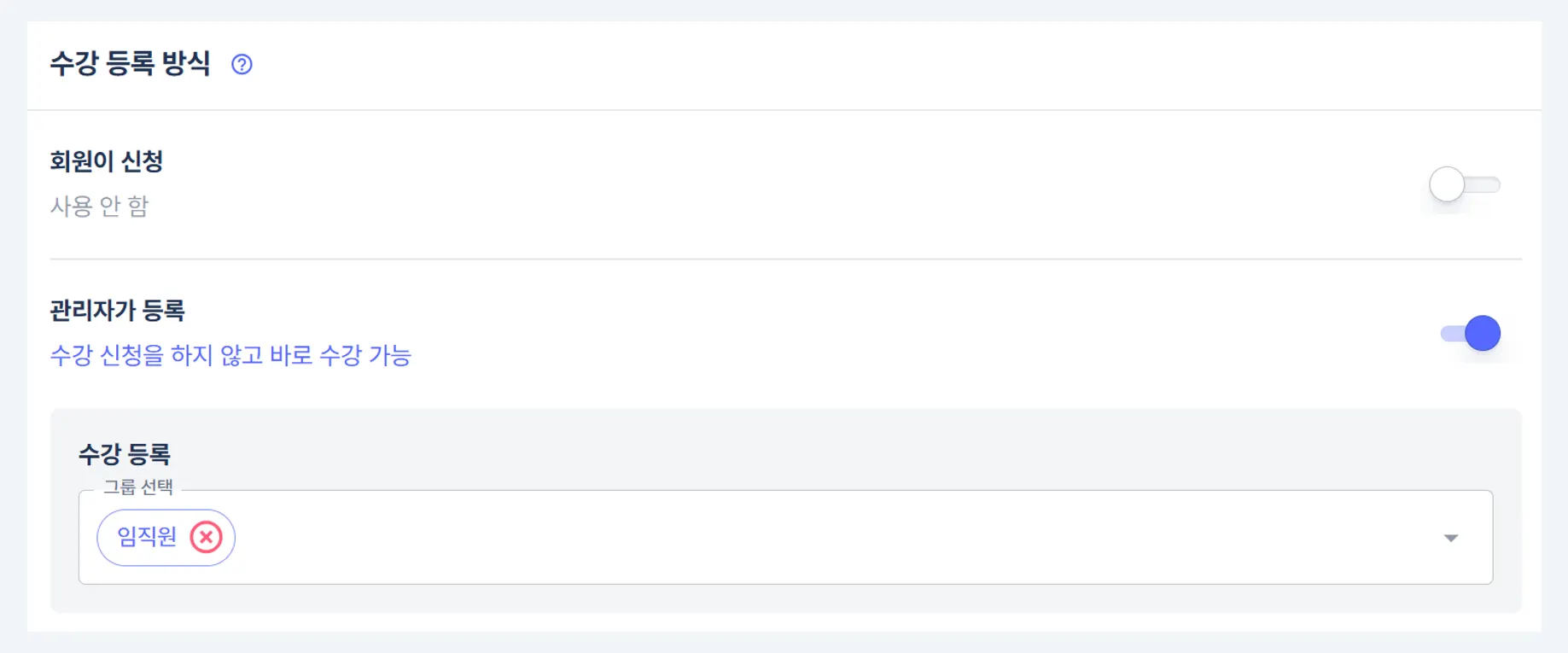관리자가 등록 : 바로 수강할 수 있는 코스로 관리자가 등록해 주 형식