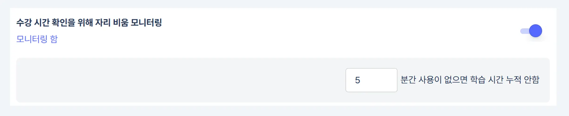 설정한 시간 동안 학습을 하지 않으면 자리 비움 팝업이 뜨고, 학습시간이 누적되지 않습니다.