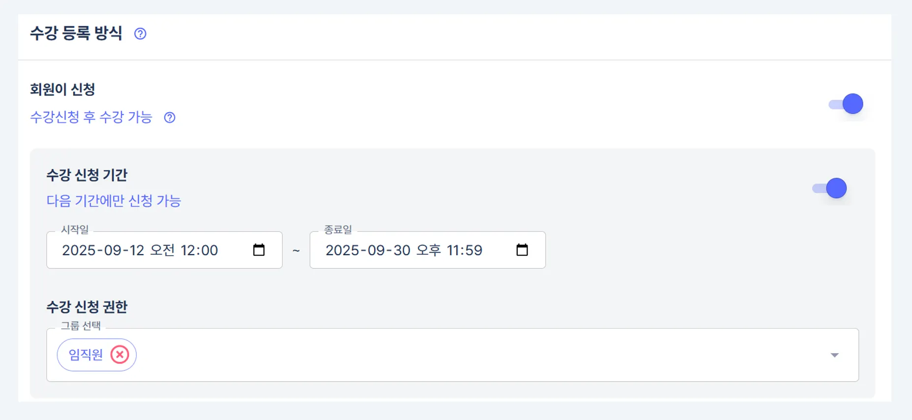 수강 신청 기간과 수강 신청 권한을 설정할 수 있습니다.