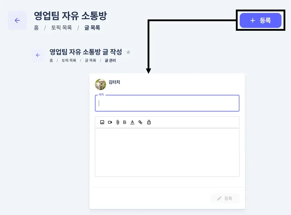 토픽 목록에서 토픽 이름을 선택 한 후 글 작성이 가능합니다.