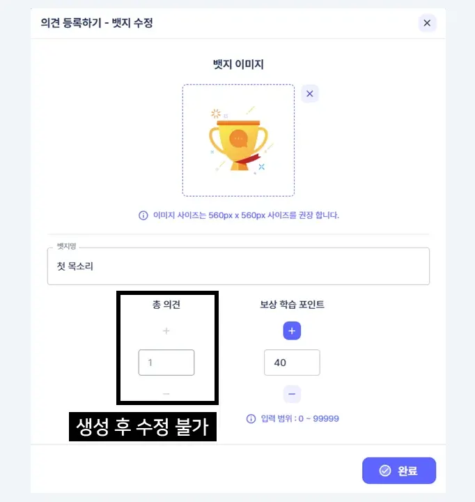 뱃지, 액자 생성 후 목표값(ex. 총 의견 수 , 좋아요 수 등)은 수정이 불가능합니다.