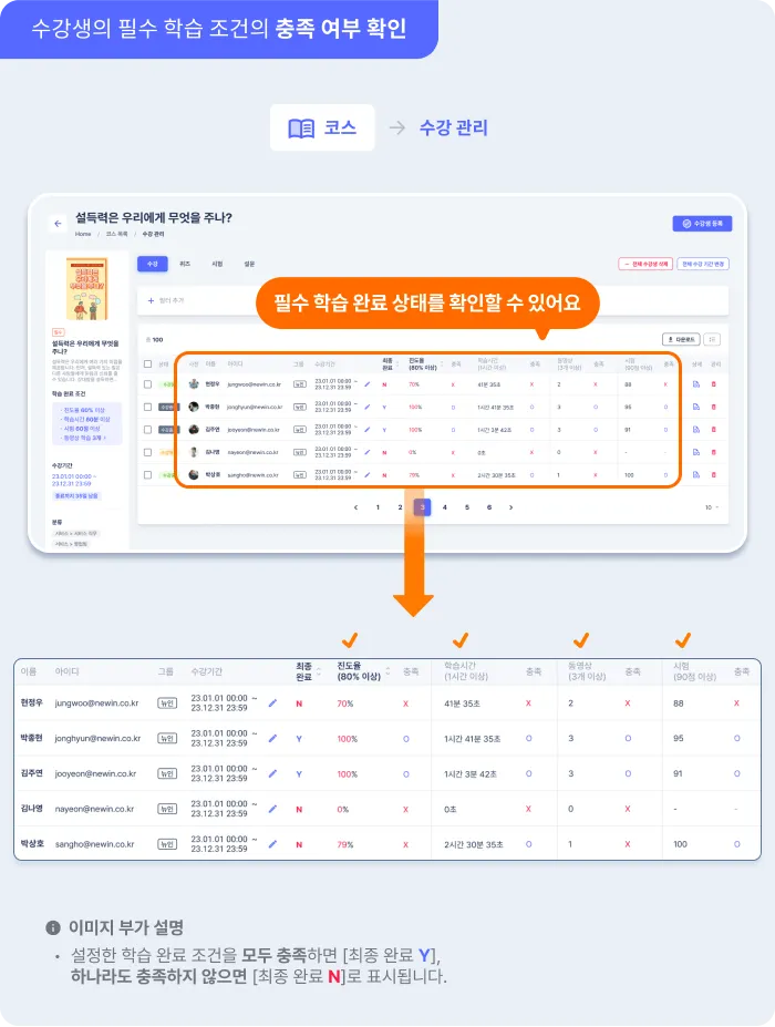 필수 코스의 경우 특정 기준(진도율, 학습시간)의 충족 여부에 따라 학습을 완료했는지, 완료하지 않았는지 확인하고 관리할 수 있습니다.