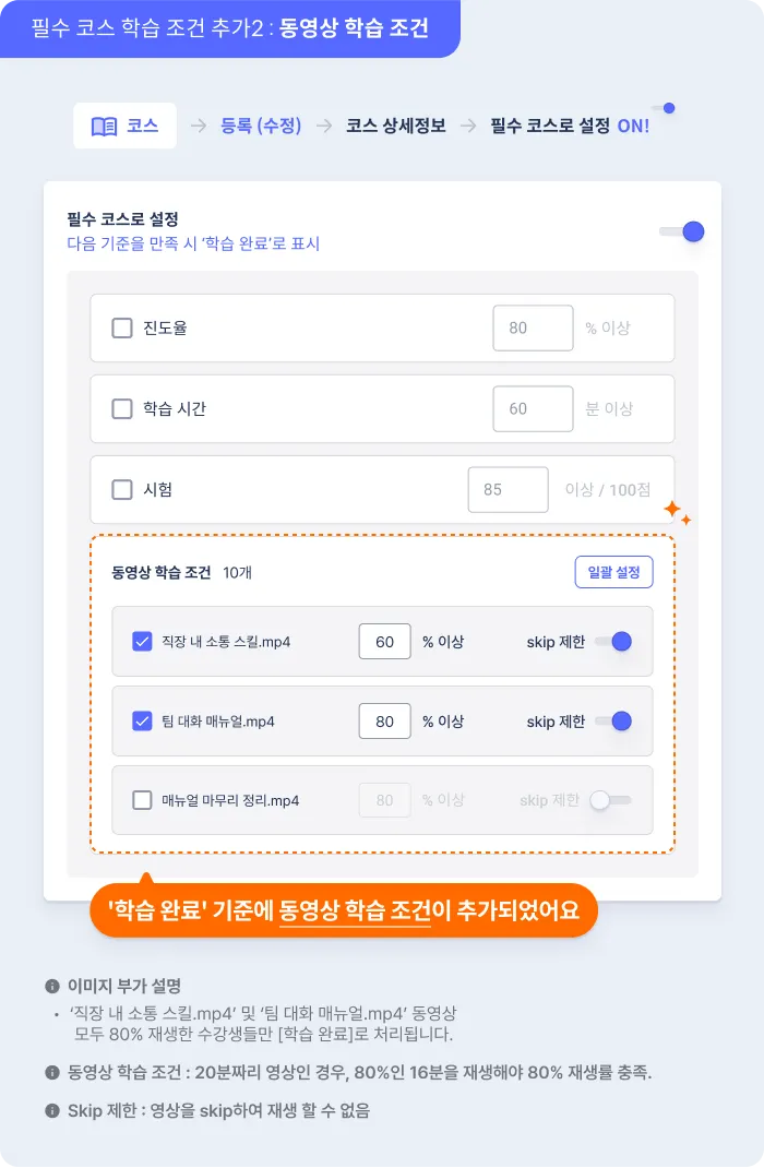 코스의 필수 학습 조건에 ‘동영상 학습 조건’을 추가할 수 있어요!