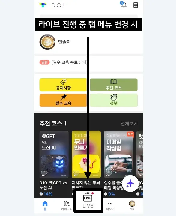 ▸ 라이브를 운영할 때는 LIVE를, 게이미피케이션을 운영할 때는 랭킹을 탭 메뉴로 구성하여, 운영 목적에 따라 유동적으로 메뉴를 구성해보세요!