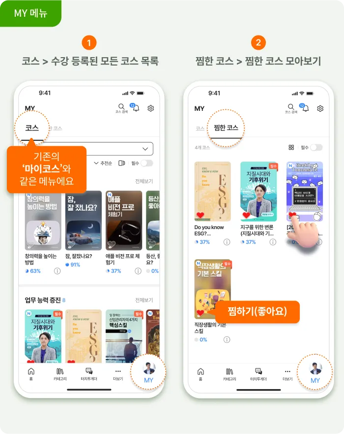 MY메뉴에서는 수강 등록된 모든 코스를 모아볼 수 있고, 학습하고 싶은 코스를 찜한 후(좋아요