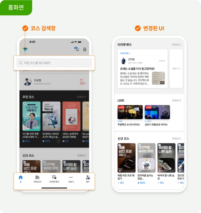 검색창이 직관적으로 개선되었고, 메뉴 아이콘 등 여러 UI가 새로워졌어요!