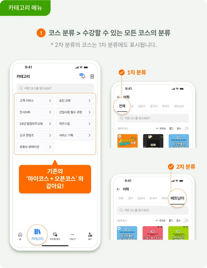 1차 분류, 2차 분류를 탭으로 이동할 수 있어요. 분류별 코스를 쉽게 확인하고 학습을 시작해보세요!