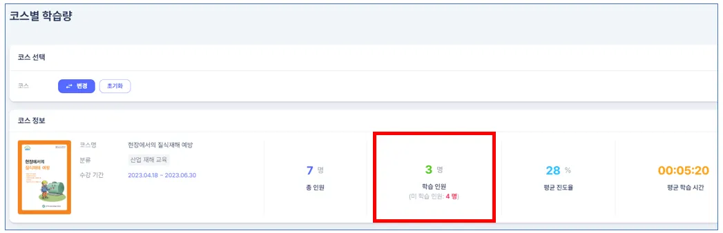 코스 총 인원, 수강 중 인원, 수강 종료 인원, 수강 예정 인원을 확인할 수 있습니다.