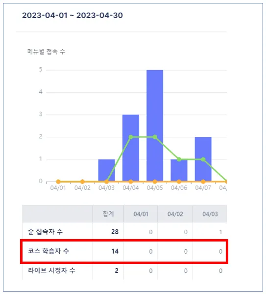 통계→접속 통계→[메뉴별 접속 수]를 선택하여 순 접속자 수, 코스 학습자 수, 라이브 시청자 수를 조회할 수 있습니다.