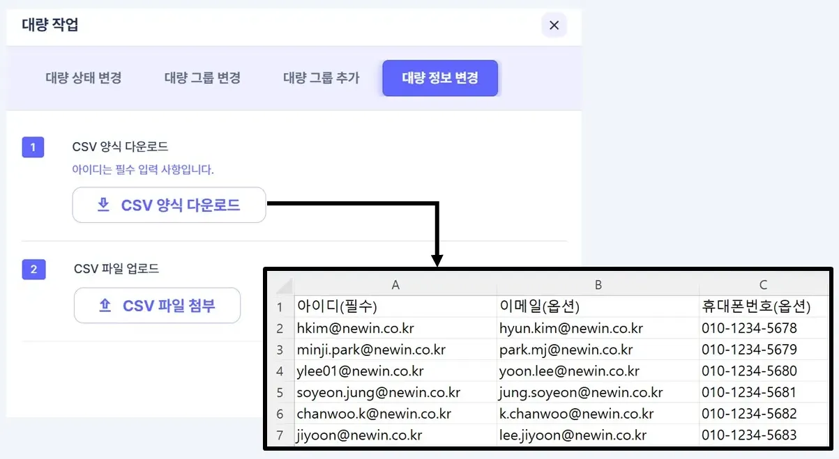 그룹·이메일·휴대폰번호를 일괄 변경해보세요.