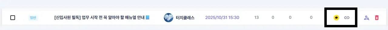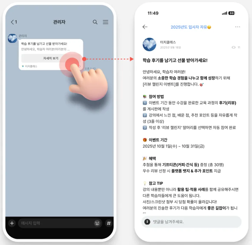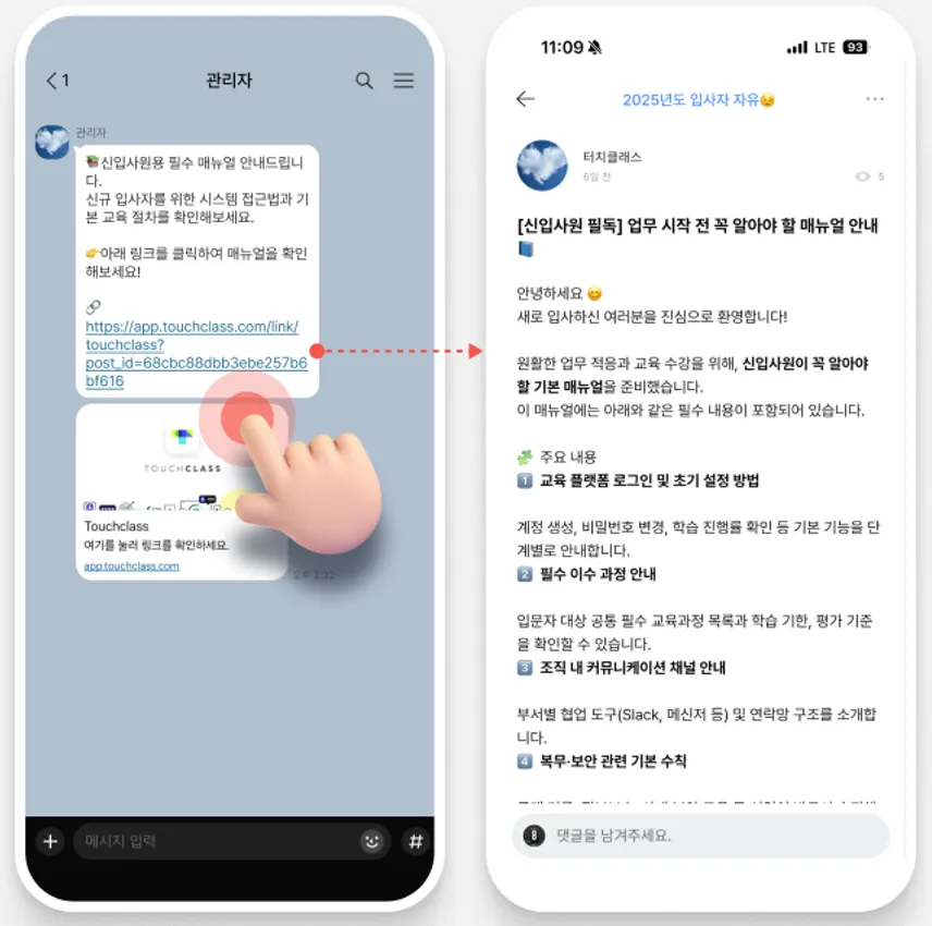 글을 공유 받은 사람이 게시판으로 바로 이동하려면 터치클래스 앱에 미리 로그인되어 있어야 해요!