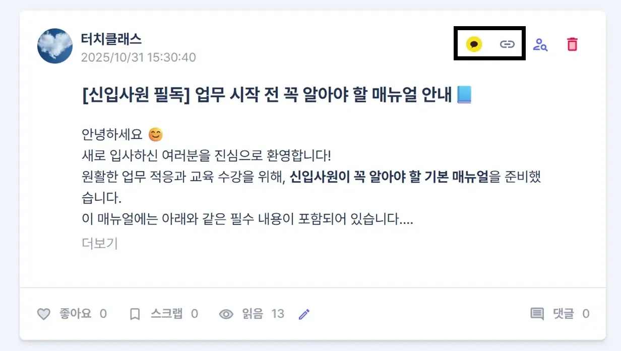 터치투게더 게시글을 간편하게 URL로 복사하거나 카카오톡으로 바로 공유할 수 있습니다. 이제 클릭 한 번으로 게시글을 빠르게 전달하고 소통 효율까지 높여보세요!