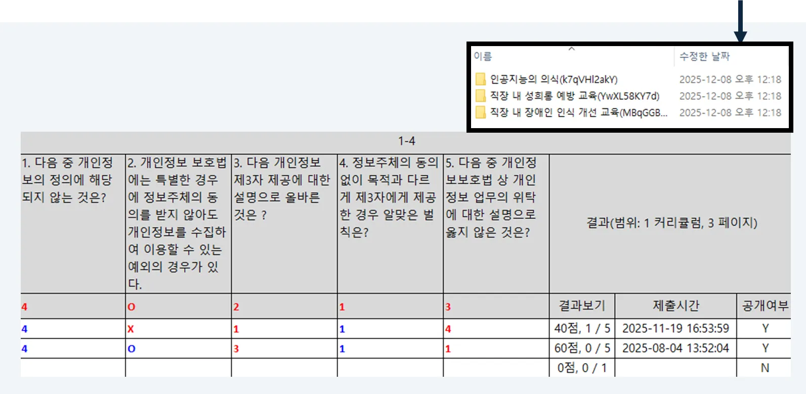 선택한 코스의 시험, 설문 결과 파일을 한 번에 다운로드 합니다. (압축 파일)