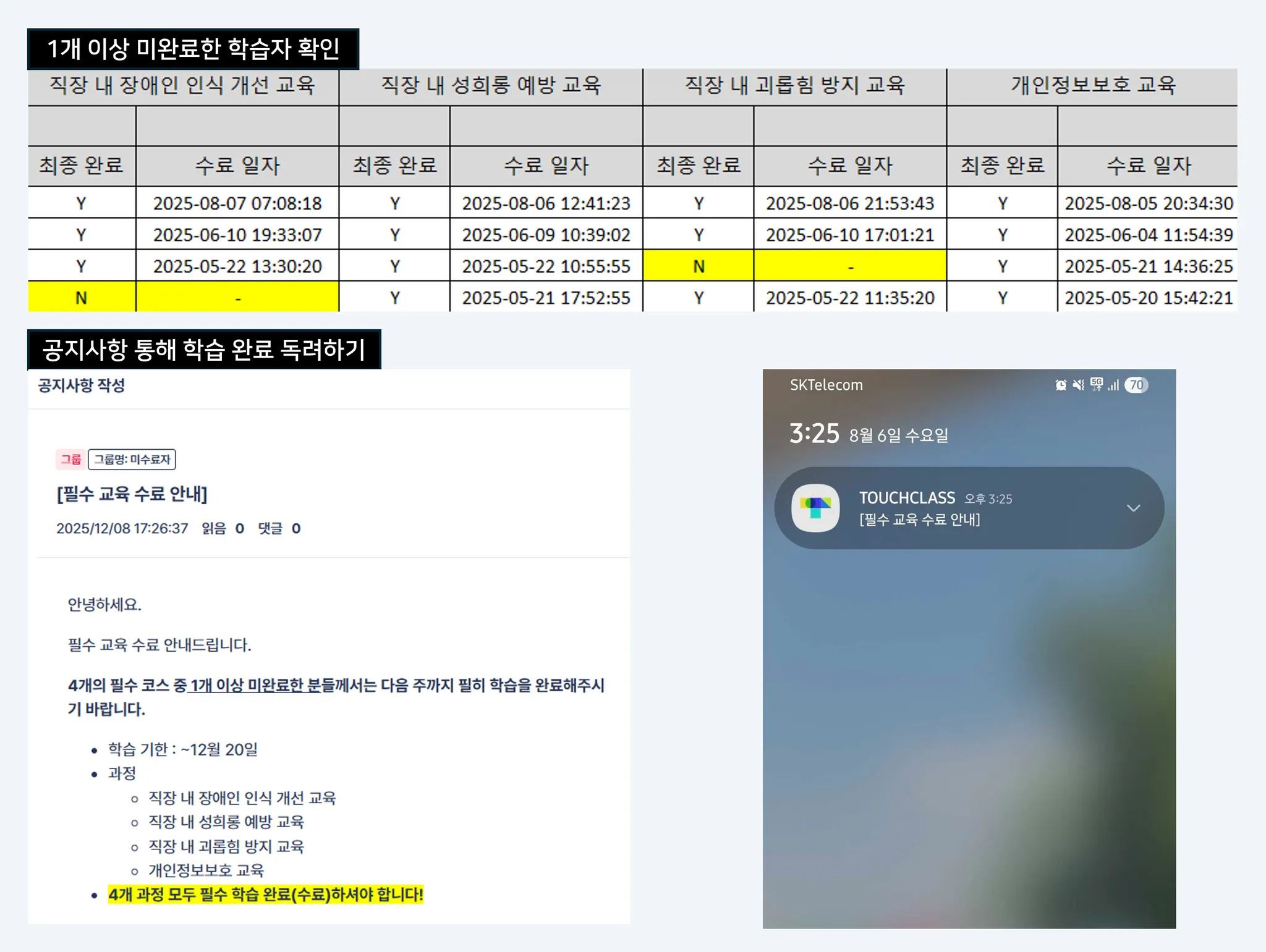 ▸ 필수 코스 4개 중 1개라도 학습 완료하지 않은 학습자를 확인하고, 공지사항을 통하여 학습 완료를 독려할 수 있습니다.