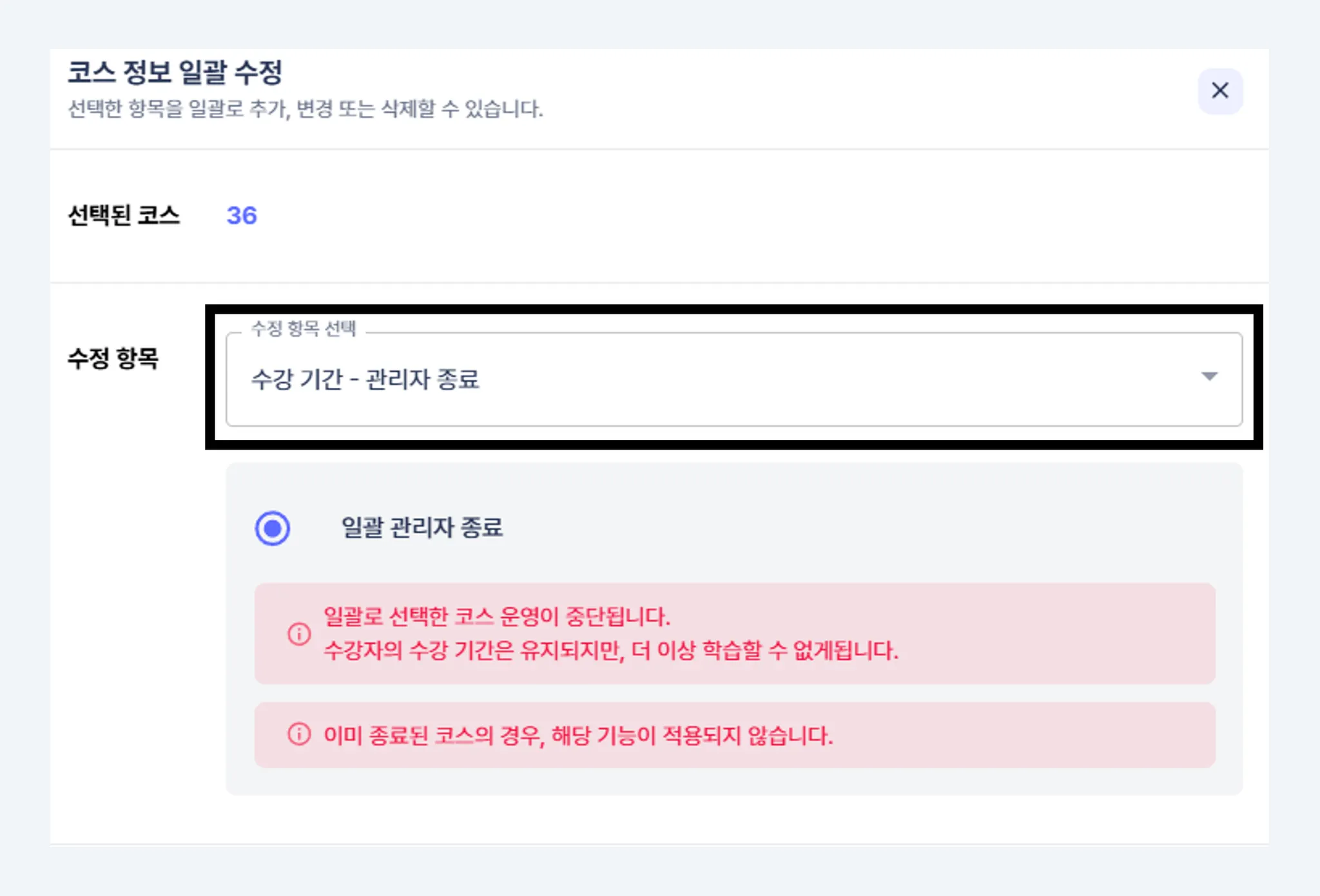 종료된 여러 코스의 수강 기간을 연장하고 싶다면, 한 번에 검색하여 일괄 수정할 수 있어요!