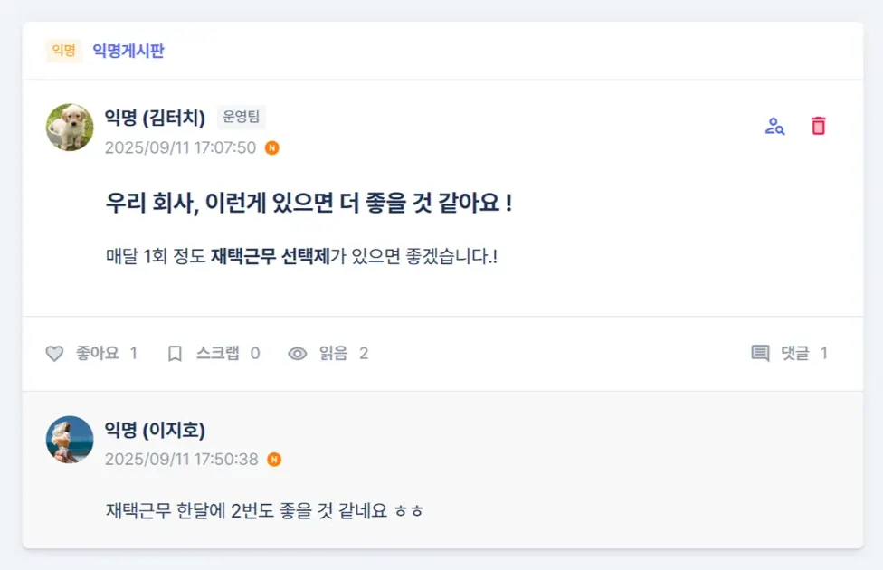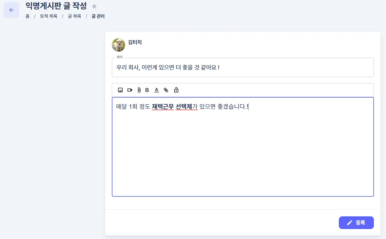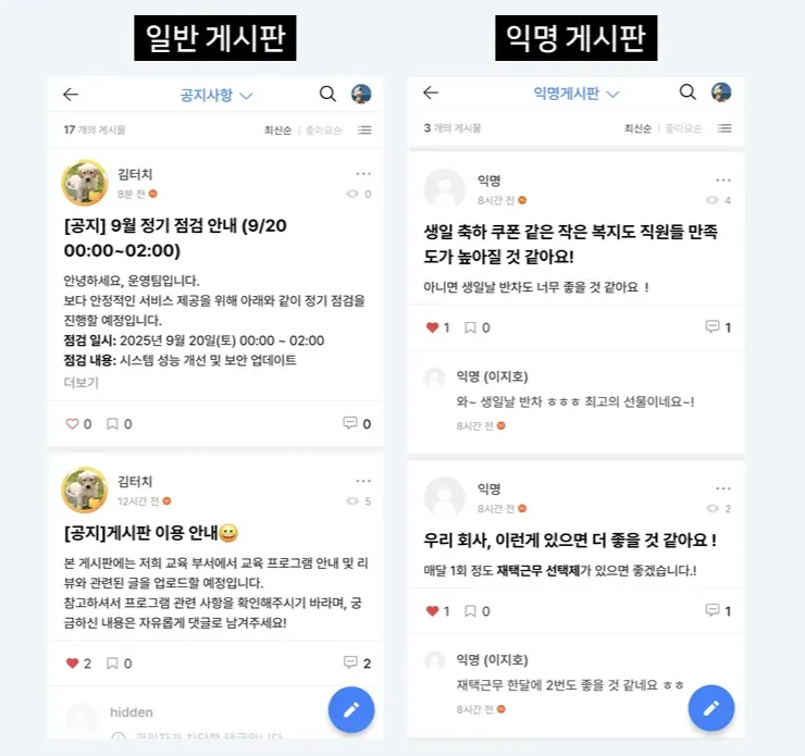 익명으로 작성되지만, 원활한 운영과 문제 상황 대응을 위해 관리자는 작성자를 확인할 수 있습니다.