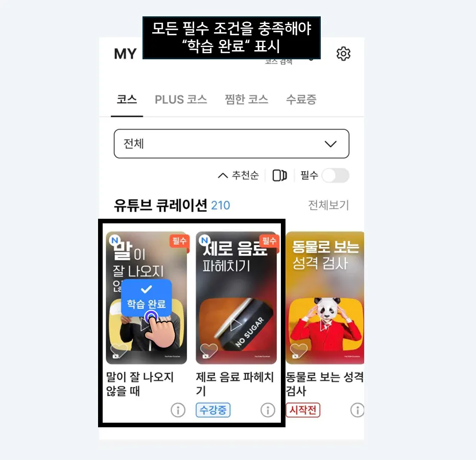 필수 조건 미충족 : 진도율 조건만 충족한 경우에도 ‘수강중’ 표시가 되고, ‘진도율 100%’는 표시되지 않기 때문에 혼선을 방지할 수 있습니다.
