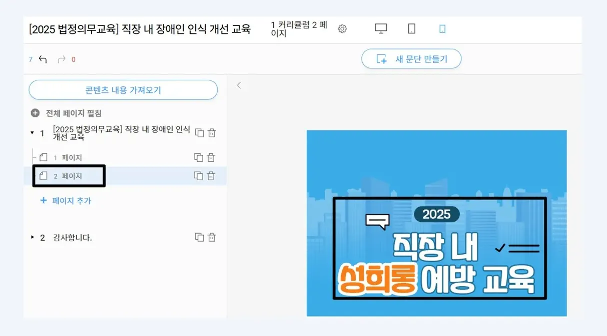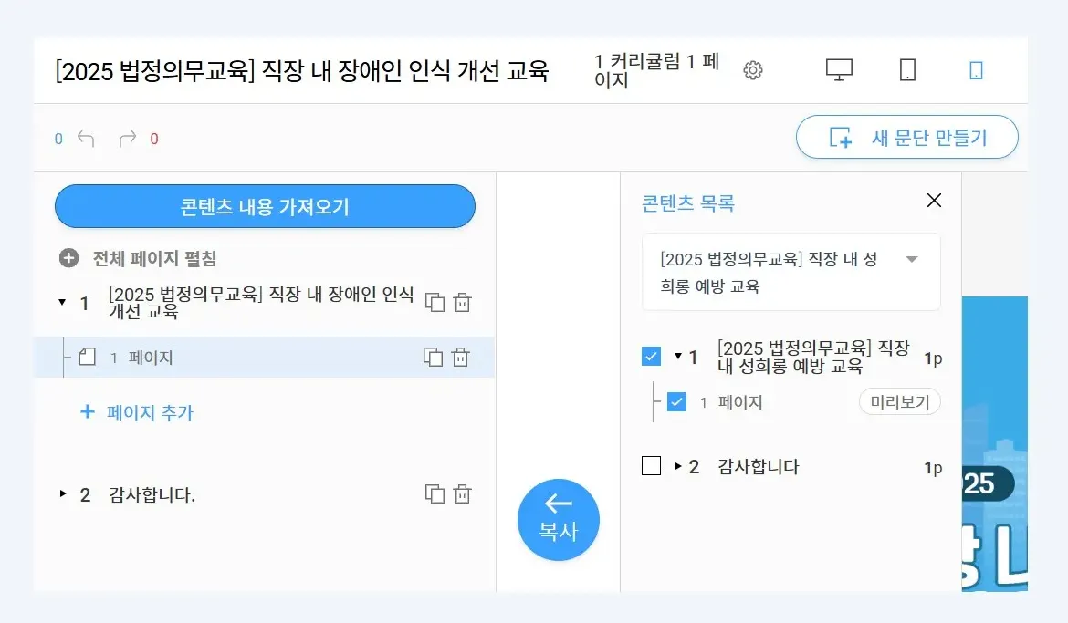 ▸ 페이지 중간에 콘텐츠를 넣고 싶다면 , 가져오려는 콘텐츠를 클릭한 뒤 ‘복사’를 누르면, 현재 선택한 페이지의 바로 다음 페이지에 붙여넣어지니 참고해주세요!