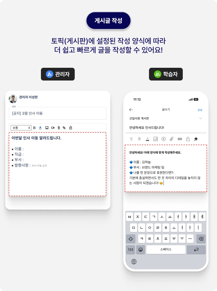 글 작성자는 토픽(게시판)에 설정된 작성 양식에 따라 더 쉽고 빠르게 글을 작성할 수 있어요!
