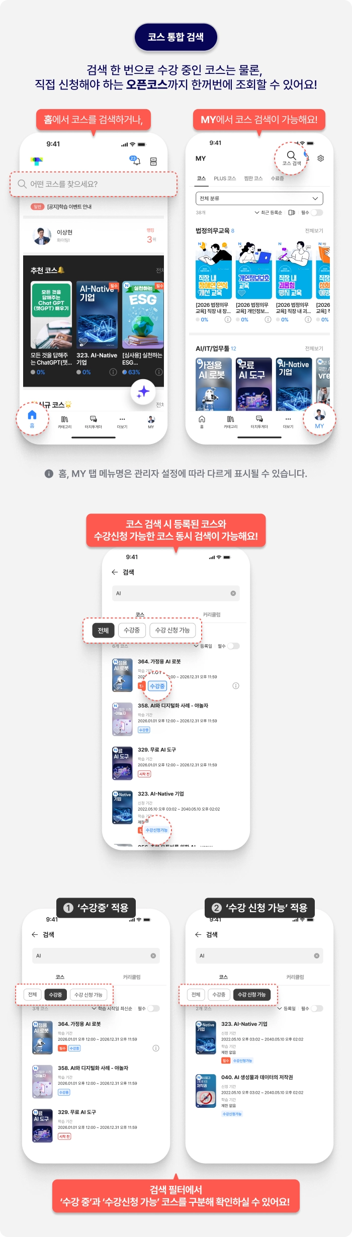 코스 검색 시 수강중 코스뿐만 아니라 ‘수강신청가능’ 코스도 함께 조회되어, 모두 확인해보세요.