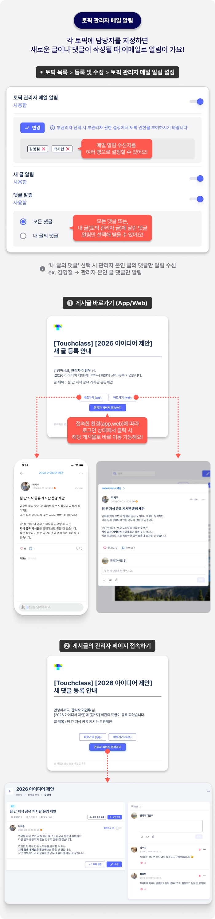 토픽마다 담당자를 지정할 수 있으며, 게시글이나 댓글이 등록되면 이메일 알림을 받아 새로운 소식을 놓치지 않고 바로 확인할 수 있어요!