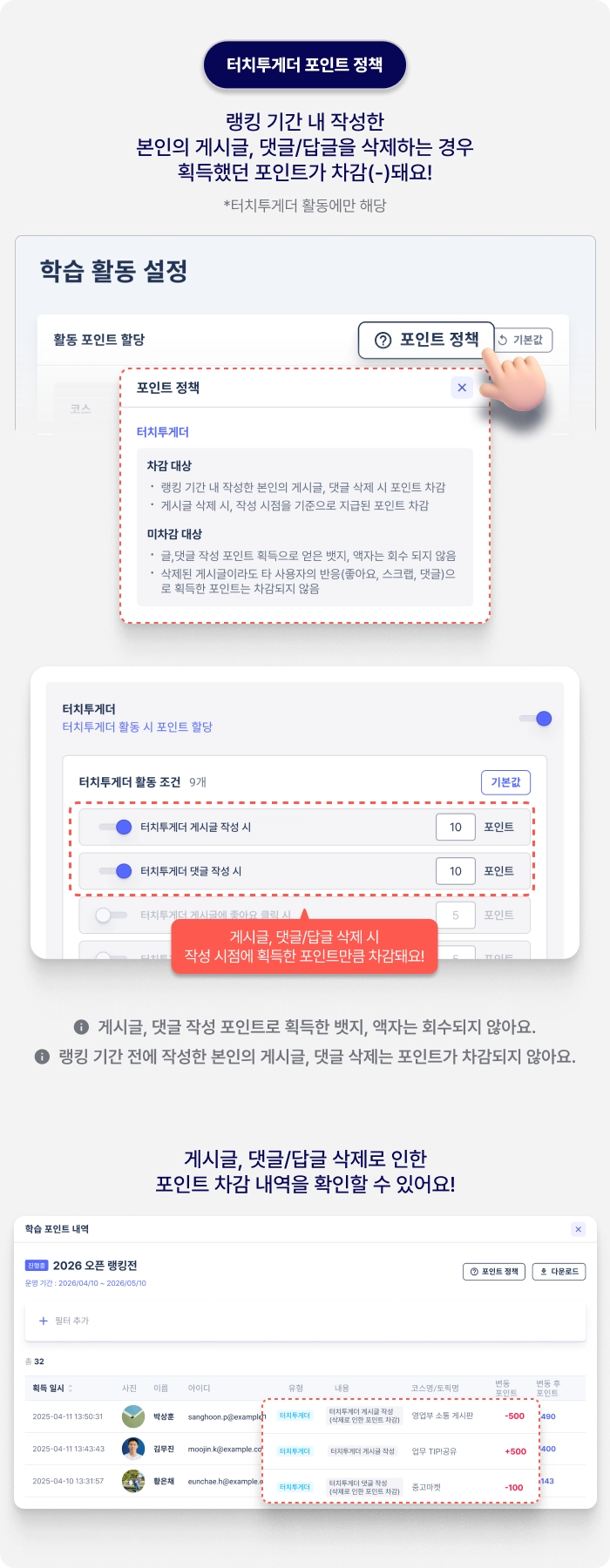 게이미피케이션을 운영에 대한 포인트 정책이 추가되었습니다. 터치투게더 활동과 관련하여 포인트가 차감되는 경우가 있어 무분별한 게시글 활동을 지양할 수 있습니다. 정책을 참고하여 랭킹을 운영해보세요