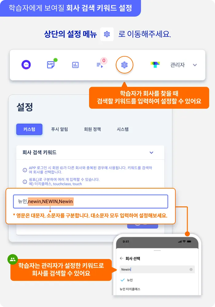 학습자가 회사를 찾을 수 있는 검색 키워드를 설정할 수 있습니다.