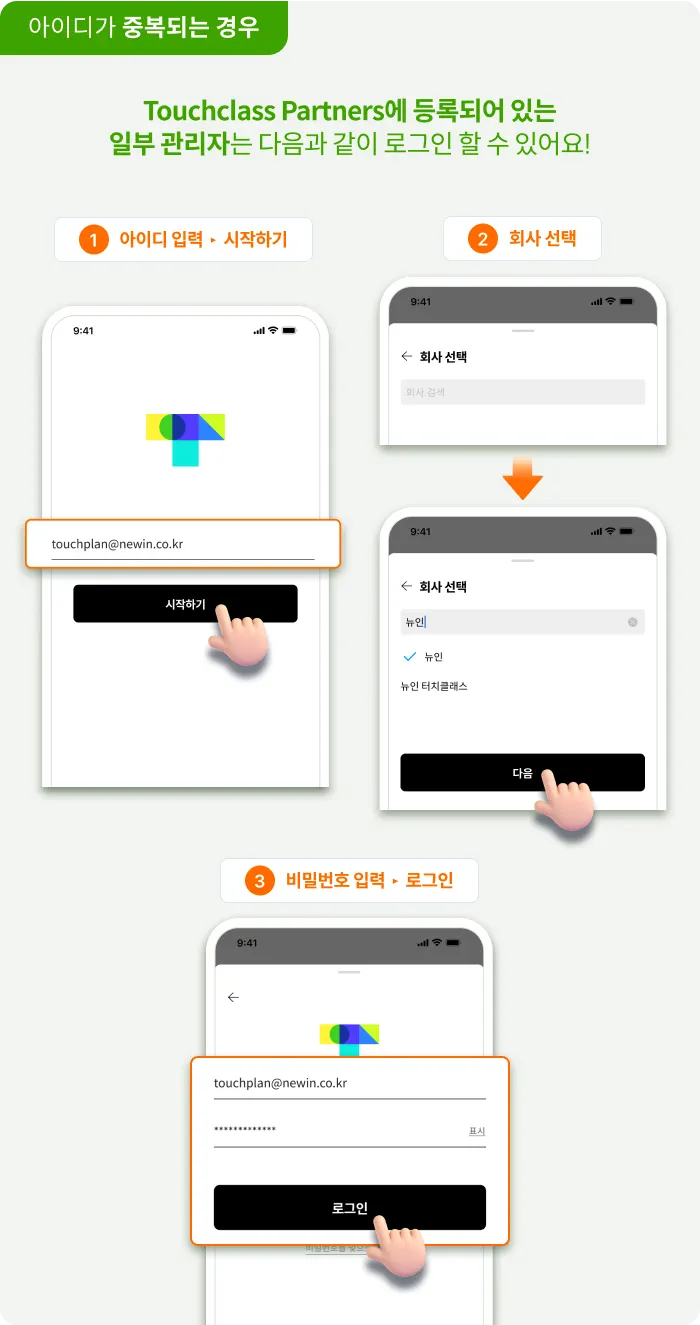 다른 회사 아이디와 중복 여부에 따라 로그인하는 방식이 다르며, 자세한 방식은 다음 내용을 확인해주세요.