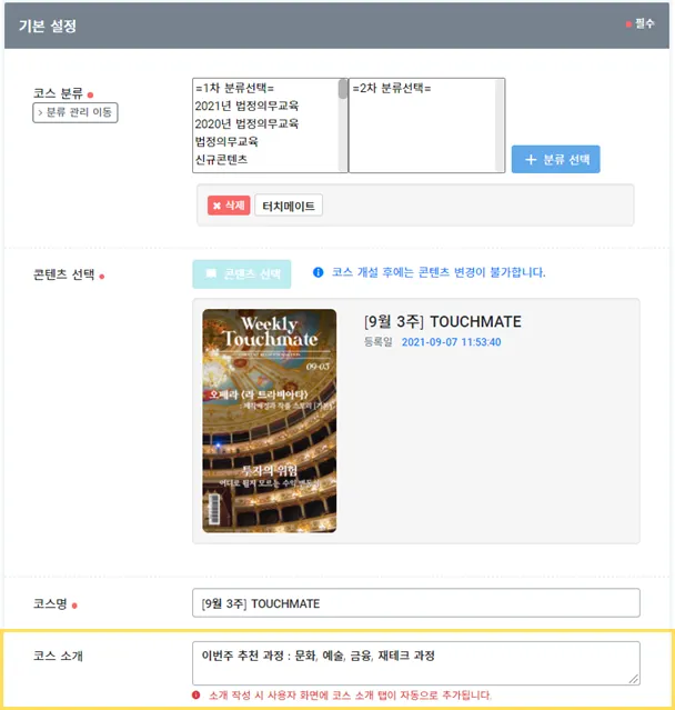'코스 소개 내용'에 검색어를 작성하여, 학습자가 원하는 코스를 찾기 쉽게 설정할 수 있어요!