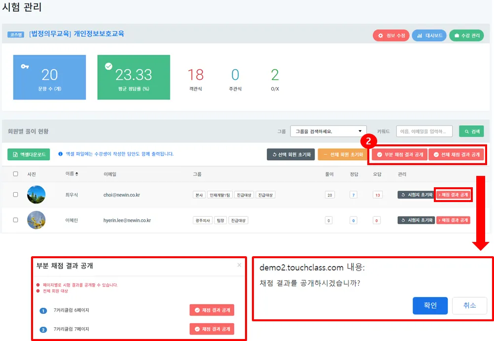 • 전체 채점 결과 공개 : 모든 페이지에 있는 시험의 채점 결과를 공개합니다.