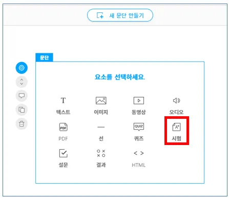 콘텐츠에 시험 문항을 넣고, 정답 공개 유형을 선택할 수 있습니다.