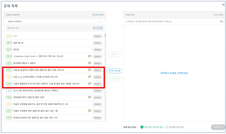 시험 문항을 넣고, 배점을 선택할 수 있습니다.