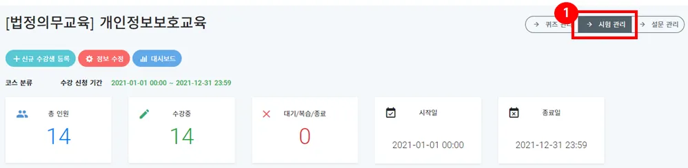 메뉴 위치:콘텐츠-->콘텐츠 목록-->에디터, 코스-->코스 목록>수강 관리>시험 관리