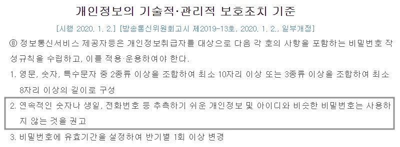 시행되고 있는 ‘개인정보의 기술적•관리적 보호조치 기준’에 따라 비밀번호 작성 규칙이 추가되었습니다. 개인정보의 안정성을 확보하기 위한 조치이며 추가된 규칙을 참고하여 운영해주세요