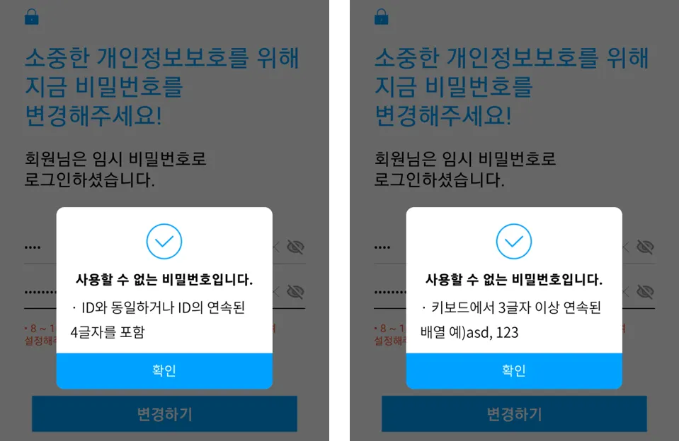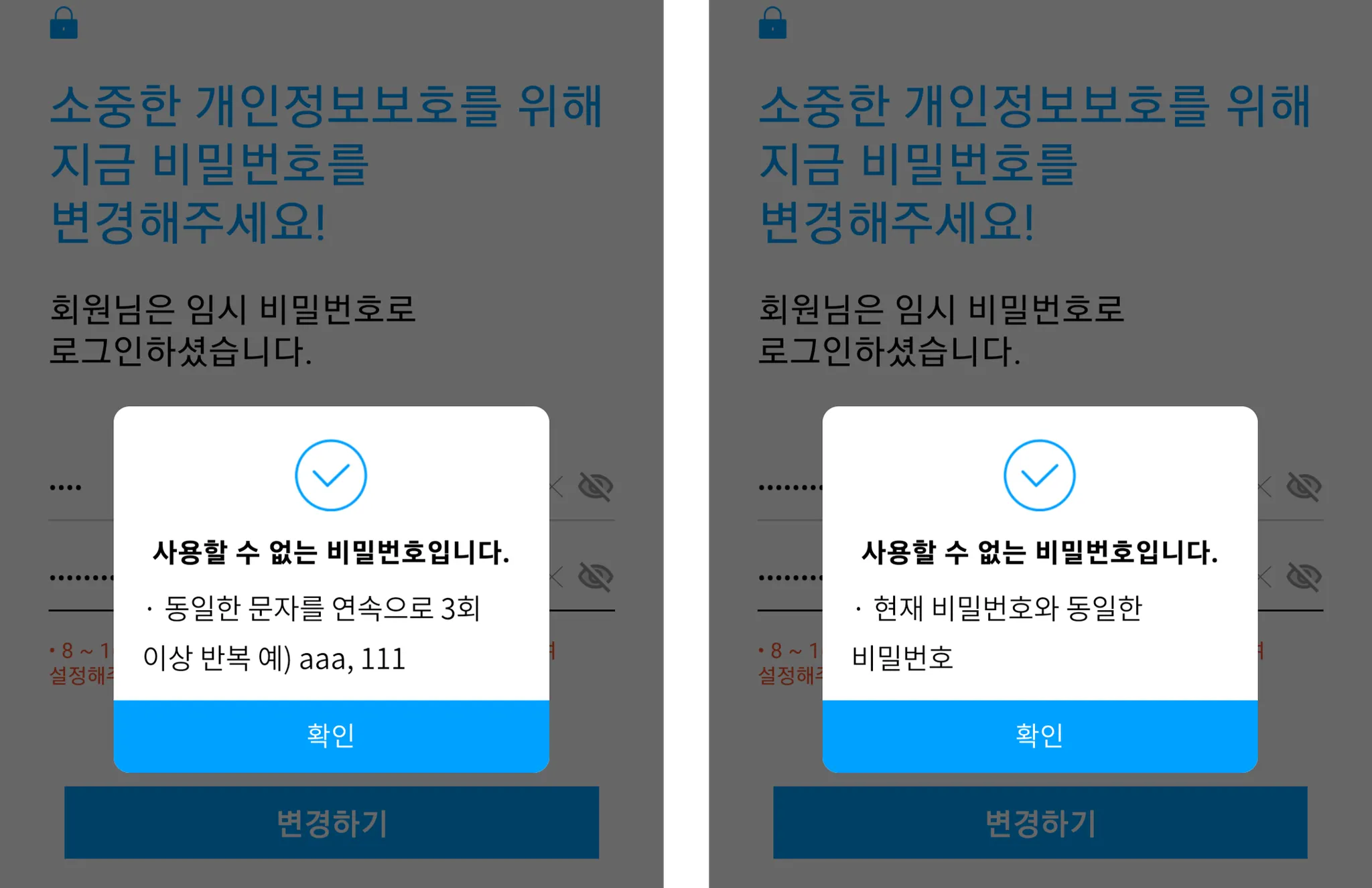 규칙에 맞지 않는 비밀번호로 변경하는 경우 팝업